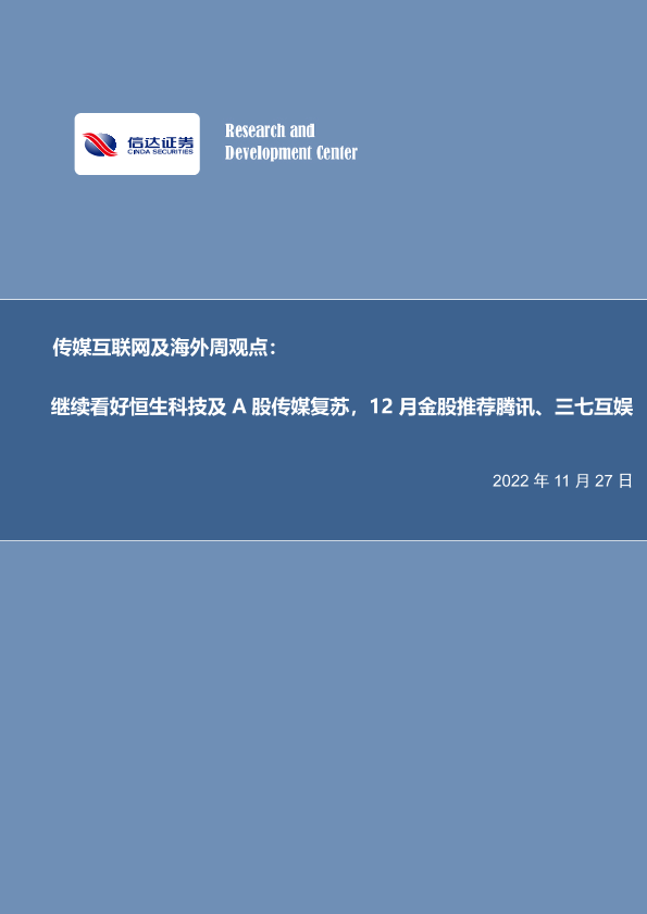 【信达证券】【20221127】继续看好恒生科技及A股传媒复苏,12月金股推荐腾讯、三七互娱-23页