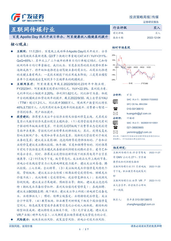 【广发证券】【20221204】百度Apollo Day技术开放日举办,阿里健康收入稳健盈利提升-27页