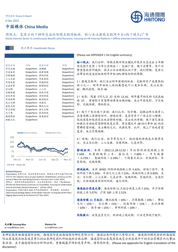 【海通国际】【20221206】中国媒体周观点:复苏方向下持续受益的传媒互联网板块-15页