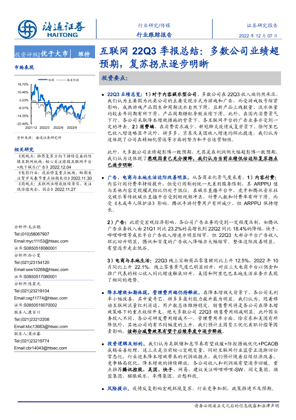 【海通证券】【20221207】互联网22Q3季报总结:多数公司业绩超预期,复苏拐点逐步明晰-11页