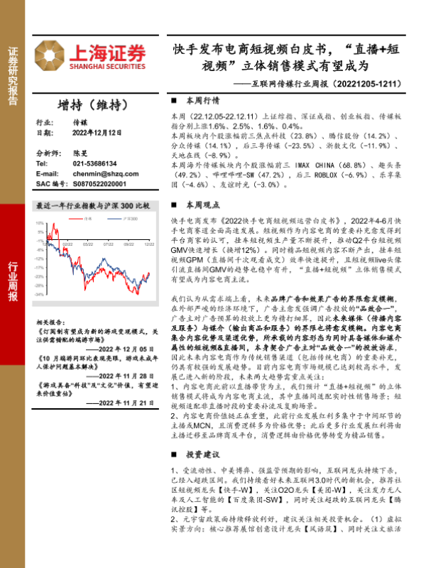 【上海证券】【20221212】互联网传媒行业周报:快手发布电商短视频白皮书,“直播+短视频”立体销售模式有望成为-22页