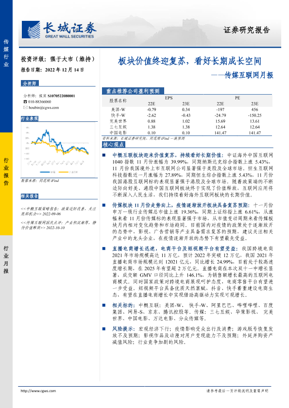 【长城证券】【20221214】传媒互联网月报:板块价值终迎复苏,看好长期成长空间-15页