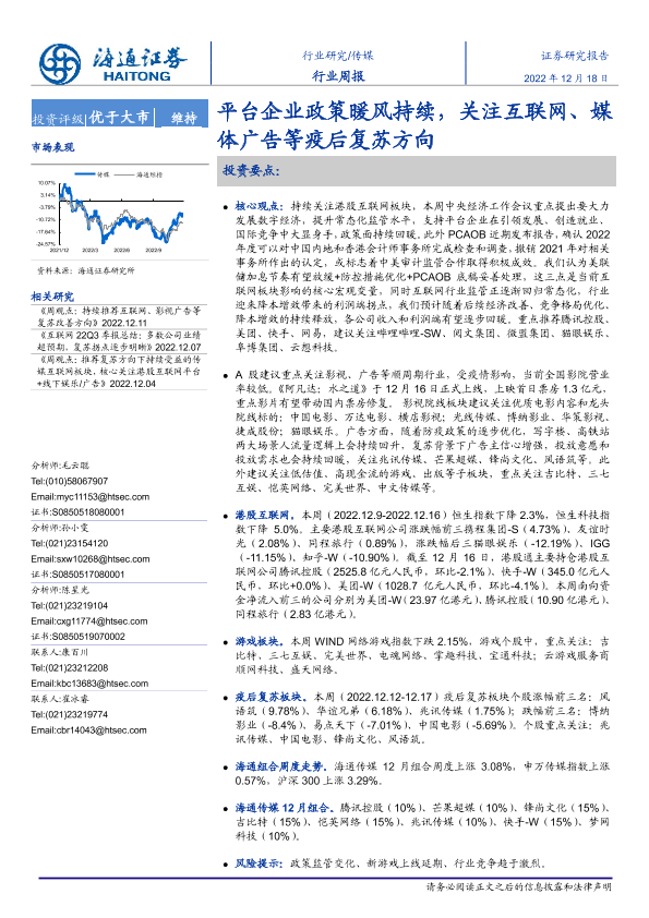 【海通证券】【20221218】平台企业政策暖风持续,关注互联网、媒体广告等疫后复苏方向-11页