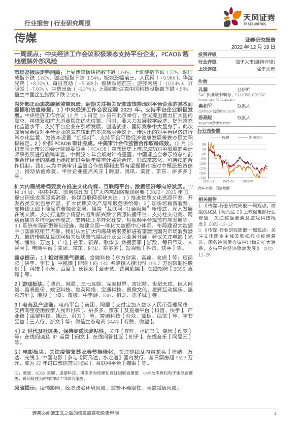 【天风证券】【20221219】传媒一周观点:中央经济工作会议积极表态支持平台企业,PCAOB落地缓解外部风险-12页