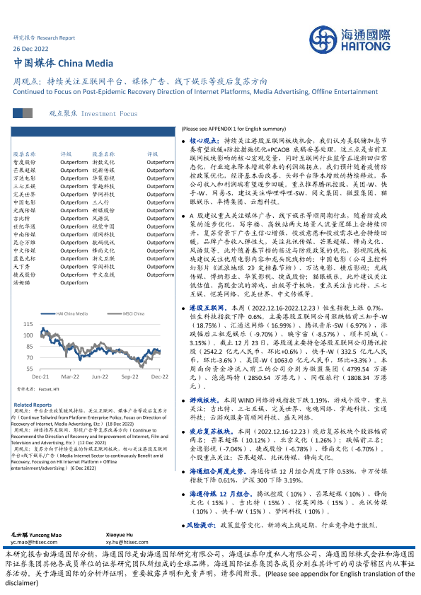 【海通国际】【20221226】中国媒体周观点:持续关注互联网平台、媒体广告、线下娱乐等疫后复苏方向-17页