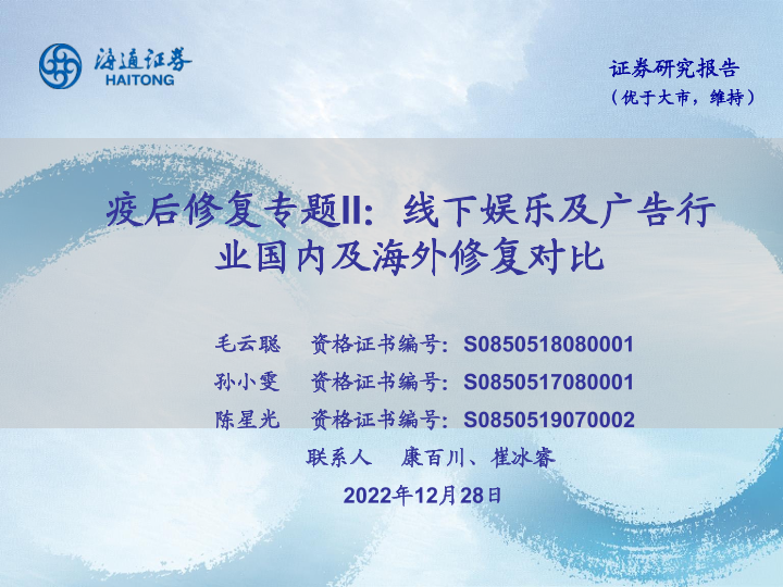 【海通证券】【20221228】传媒行业疫后修复专题II:线下娱乐及广告行业国内及海外修复对比-21页