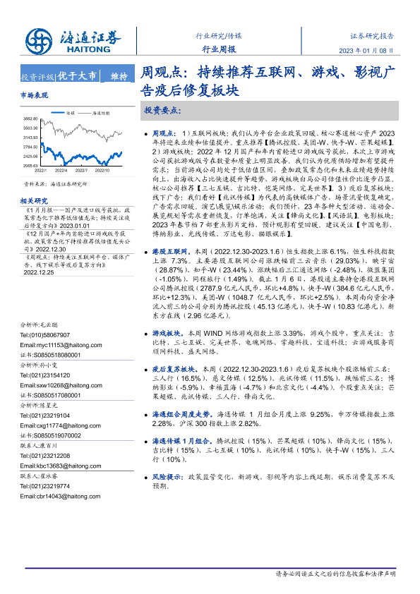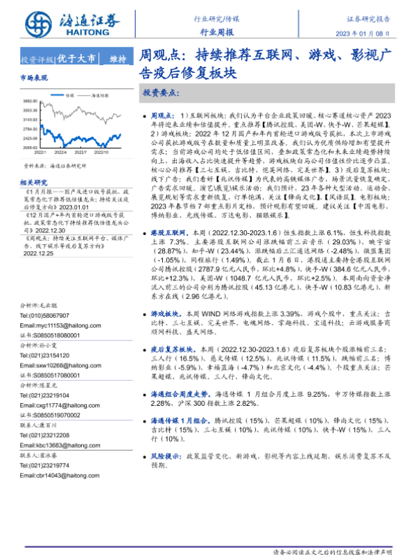【海通证券】【20230108】传媒周观点:持续推荐互联网、游戏、影视广告疫后修复板块-11页