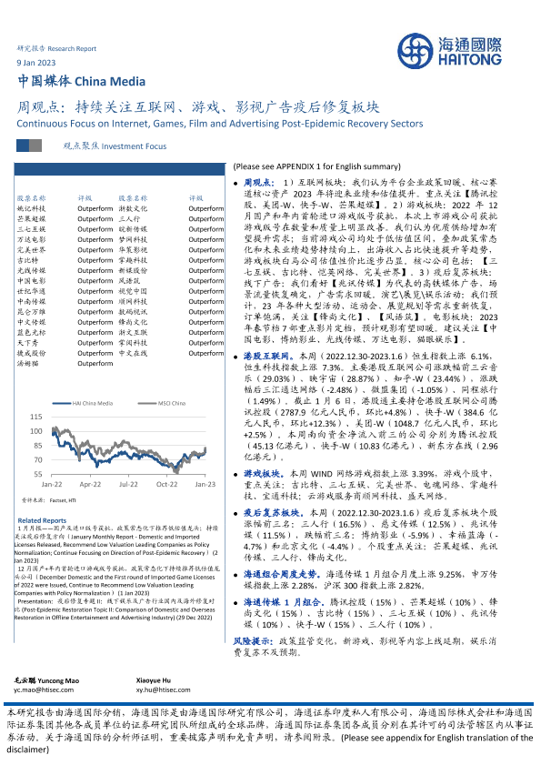 【海通国际】【20230109】中国媒体周观点:持续关注互联网、游戏、影视广告疫后修复板块-18页