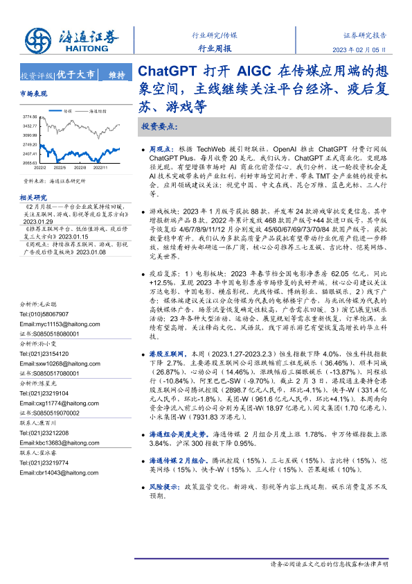 【海通证券】【20230205】传媒行业周报:ChatGPT打开AIGC在传媒应用端的想象空间-13页
