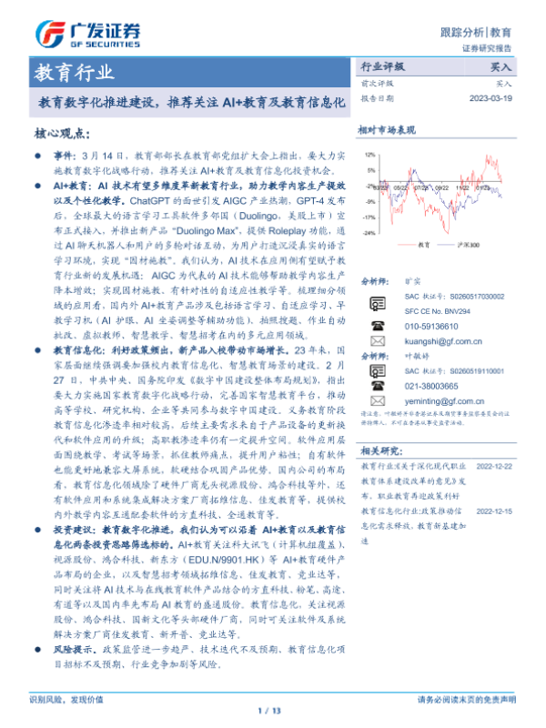 【广发证券】【20230319】教育行业跟踪分析:教育数字化推进建设,推荐关注AI+教育及教育信息化-13页