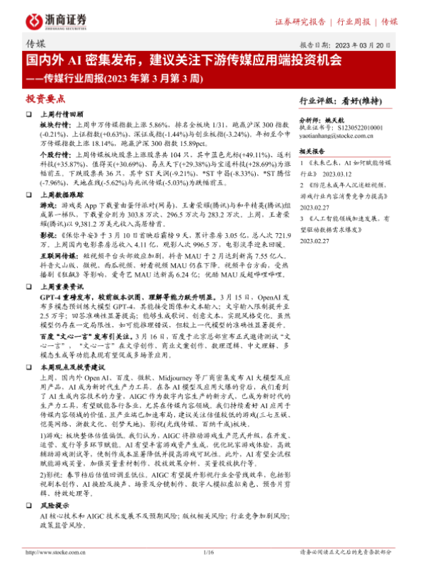 【浙商证券】【20230320】传媒行业周报:国内外AI密集发布,建议关注下游传媒应用端投资机会-16页