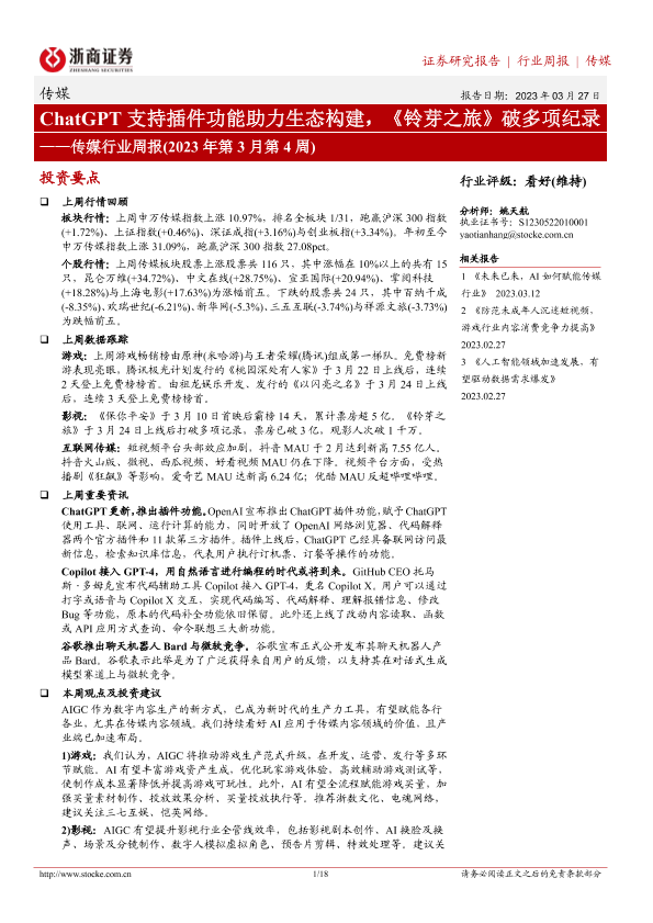 【浙商证券】【20230327】ChatGPT支持插件功能助力生态构建,《铃芽之旅》破多项纪录-18页