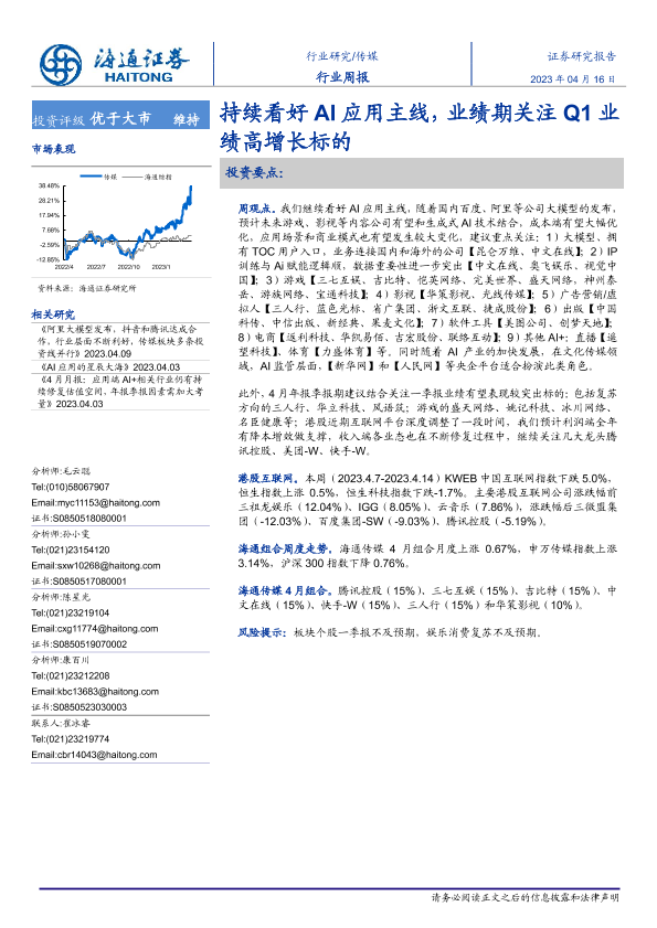 【海通证券】【20230416】传媒行业周报:持续看好AI应用主线,业绩期关注Q1业绩高增长标的-10页