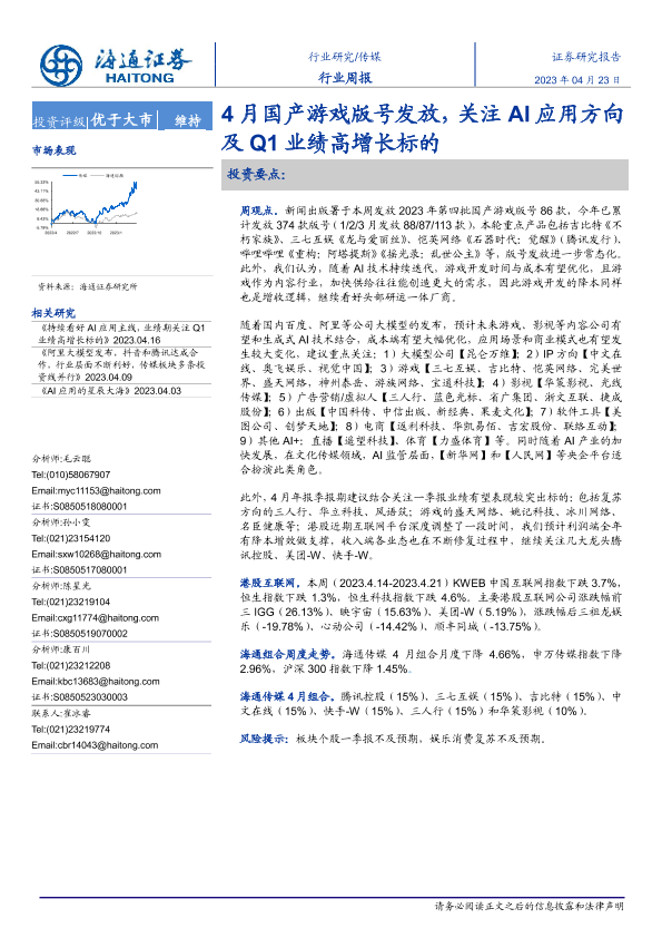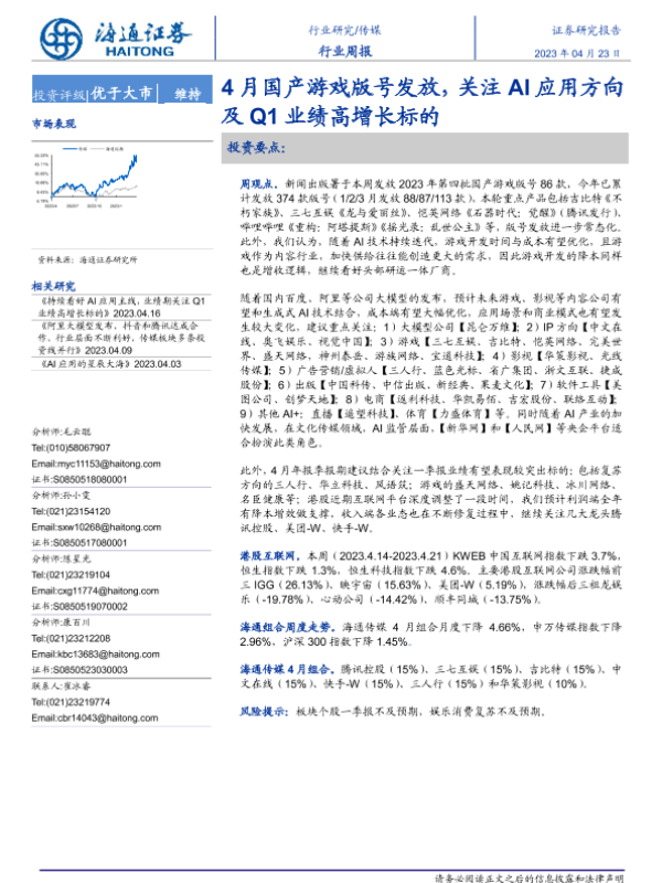 【海通证券】【20230423】4月国产游戏版号发放,关注AI应用方向及Q1业绩高增长标的-11页