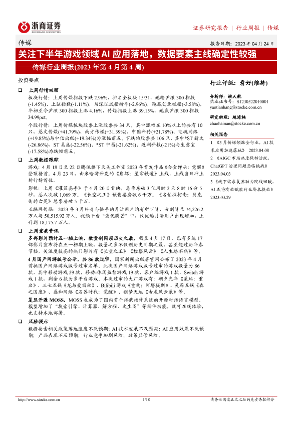 【浙商证券】【20230424】关注下半年游戏领域AI应用落地,数据要素主线确定性较强-18页