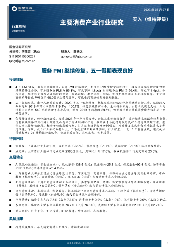 【国金证券】【20230507】主要消费产业行业周报:服务PMI继续修复,五一假期表现良好-16页