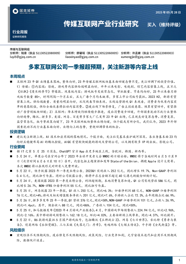 【国金证券】【20230528】传媒互联网产业行业研究:多家互联网公司一季报超预期,关注新游等内容上线-23页