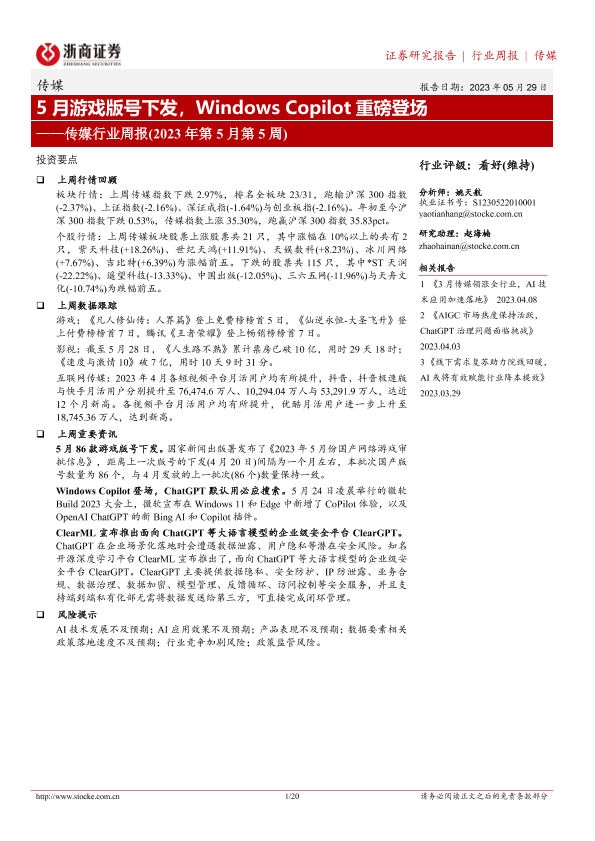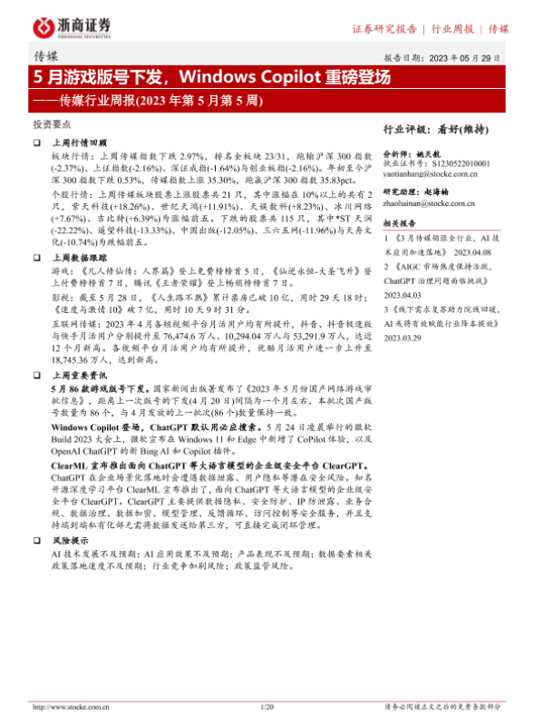 【浙商证券】【20230529】5月游戏版号下发,Windows Copilot重磅登场-20页