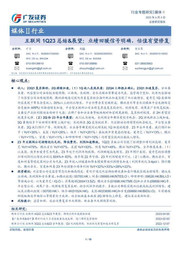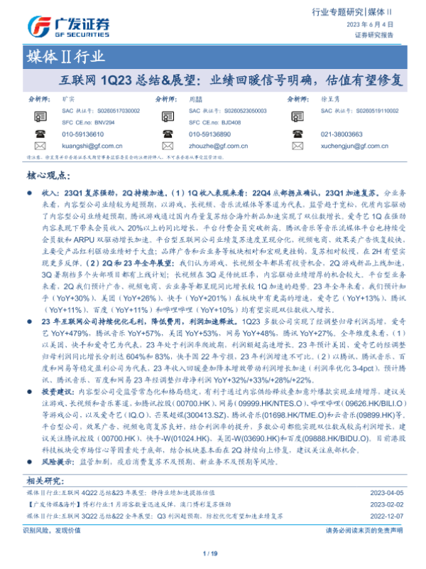 【广发证券】【20230604】互联网1Q23总结&展望:业绩回暖信号明确,估值有望修复-19页