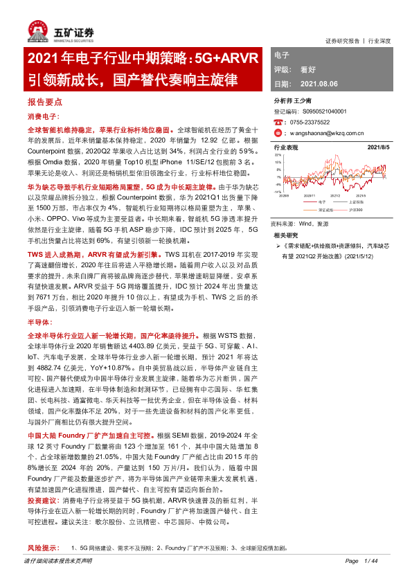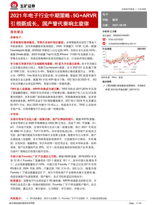 【五矿证券】【20210806】2021年电子行业中期策略:5G+ARVR引领新成长,国产替代奏响主旋律-44页