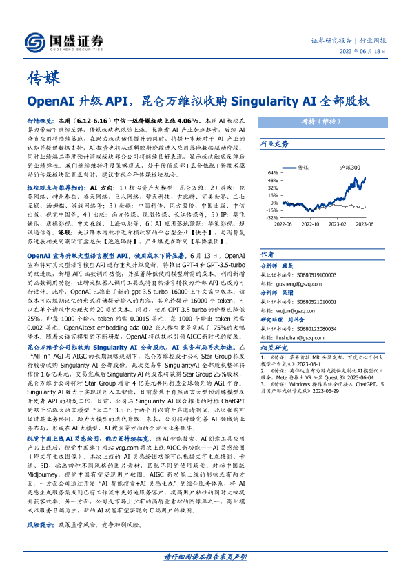 【国盛证券】【20230618】传媒行业周报:OpenAI升级API,昆仑万维拟收购Singularity AI全部股权-10页