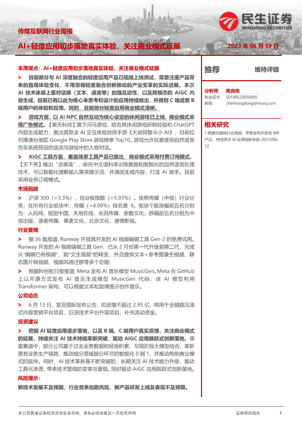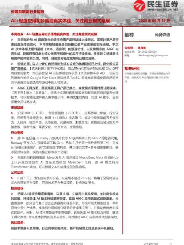 【民生证券】【20230619】传媒互联网行业周报:AI+轻度应用初步落地真实体验,关注商业模式延展-19页
