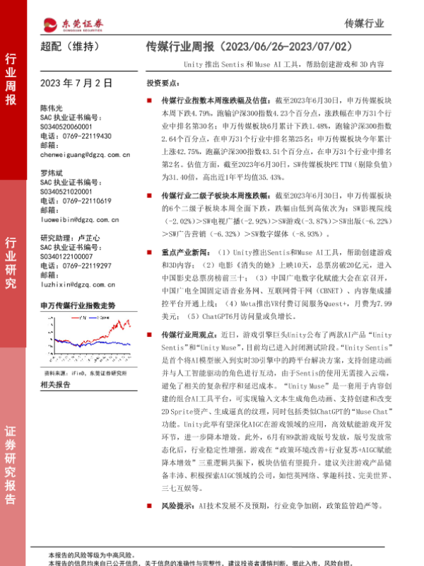 【东莞证券】【20230702】传媒行业周报:Unity推出Sentis和MuseAI工具,帮助创建游戏和3D内容-13页