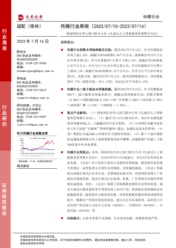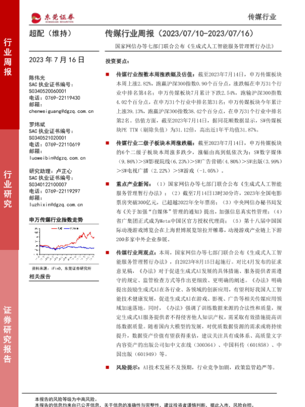 【东莞证券】【20230716】传媒行业周报:国家网信办等七部门联合公布《生成式人工智能服务管理暂行办法》-13页