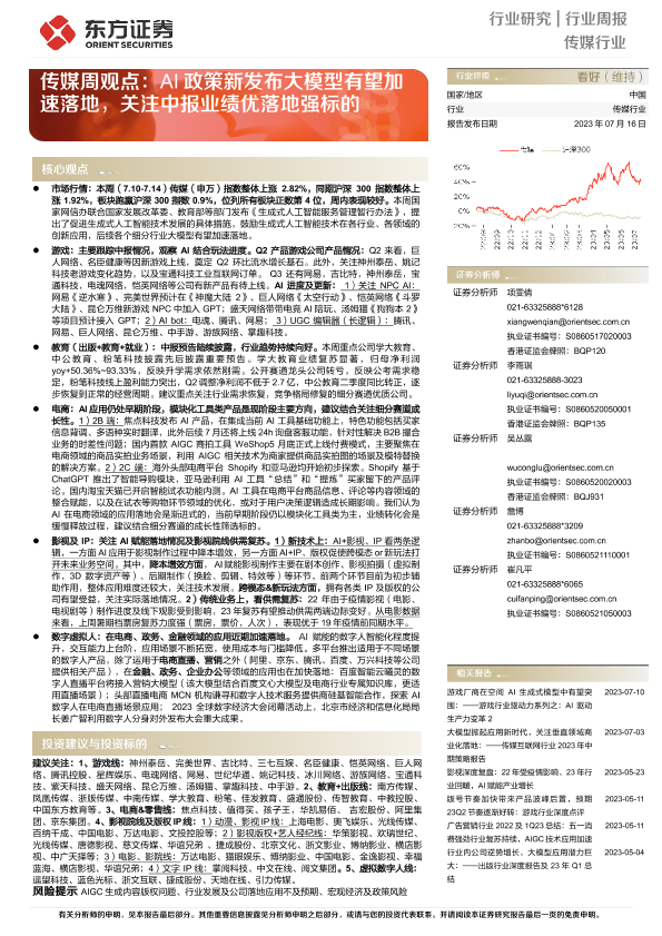 【东方证券】【20230716】传媒周观点:AI政策新发布大模型有望加速落地,关注中报业绩优落地强标的-12页