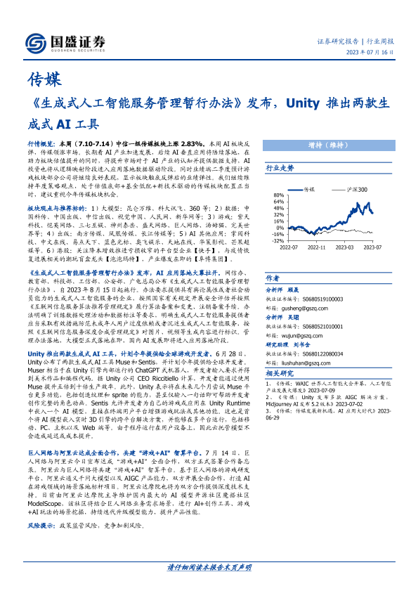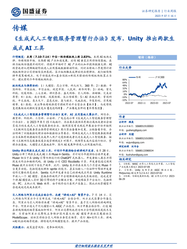 【国盛证券】【20230716】生成式人工智能服务管理暂行办法发布,Unity推出两款生成式AI工具-10页