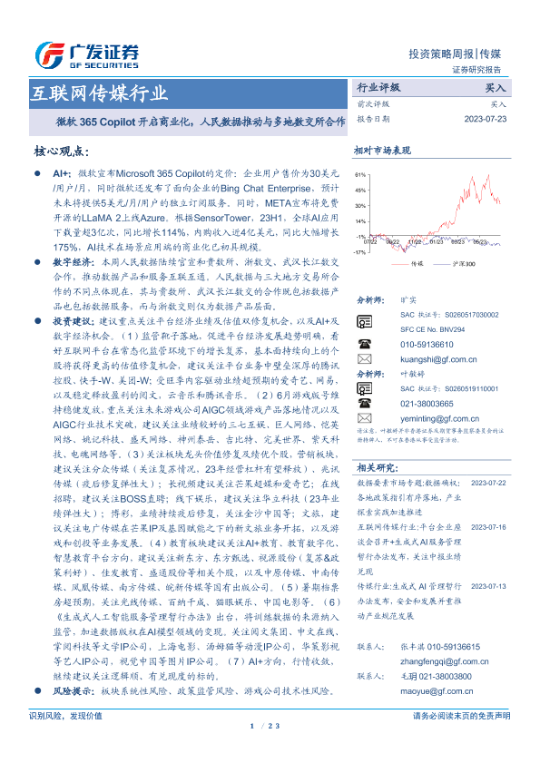 【广发证券】【20230723】互联网传媒行业投资策略周报:微软365 Copilot开启商业化,人民数据推动与多地数交所合作-23页