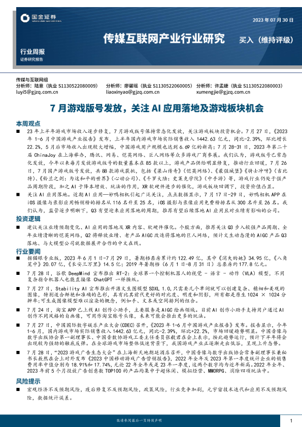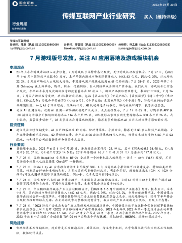 【国金证券】【20230730】7月游戏版号发放,关注AI应用落地及游戏板块机会-22页