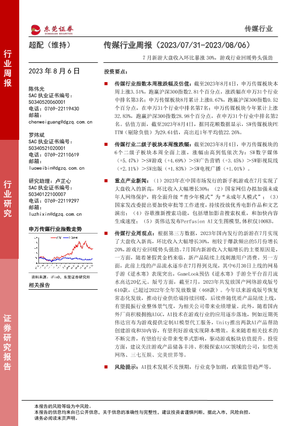 【东莞证券】【20230806】传媒行业周报:7月新游大盘收入环比暴涨30%,游戏行业回暖势头强劲-13页