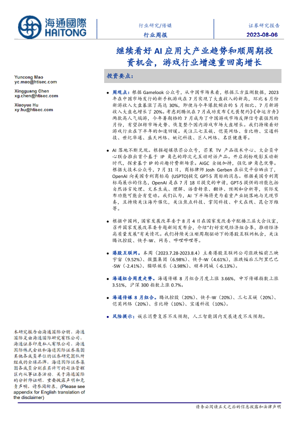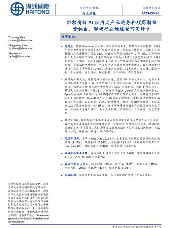 【海通国际】【20230806】继续看好AI应用大产业趋势和顺周期投资机会,游戏行业增速重回高增长-16页
