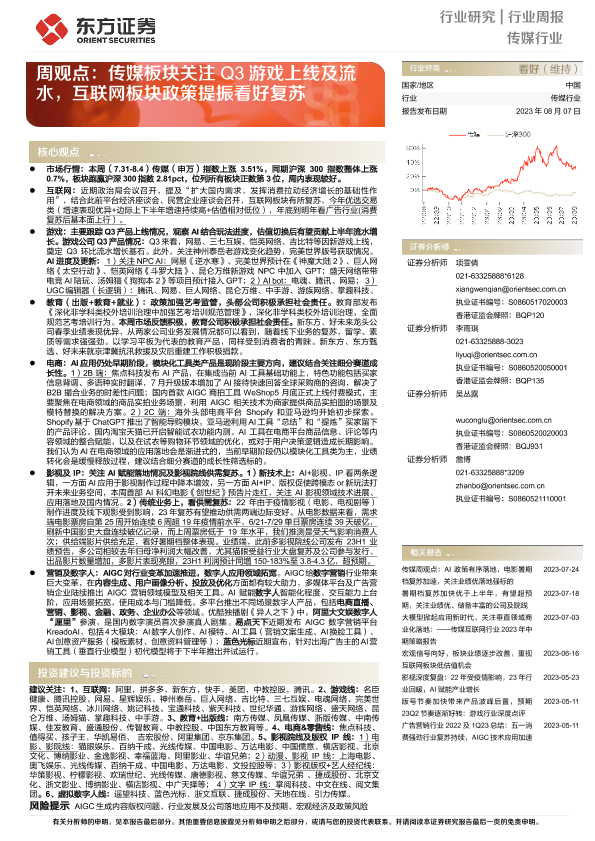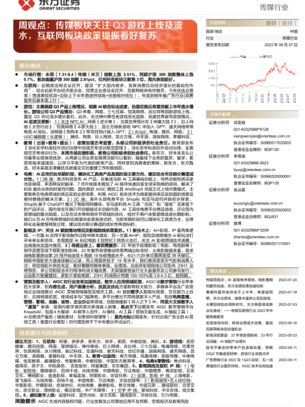【东方证券】【20230807】传媒周观点:传媒板块关注Q3游戏上线及流水,互联网板块政策提振看好复苏-14页