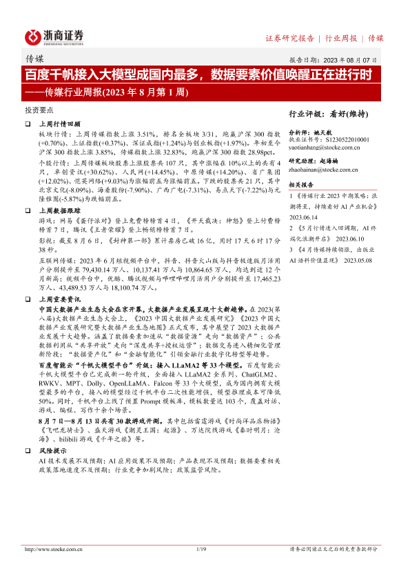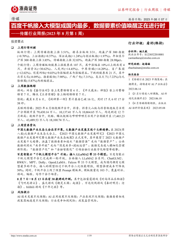 【浙商证券】【20230807】百度千帆接入大模型成国内最多,数据要素价值唤醒正在进行时-19页