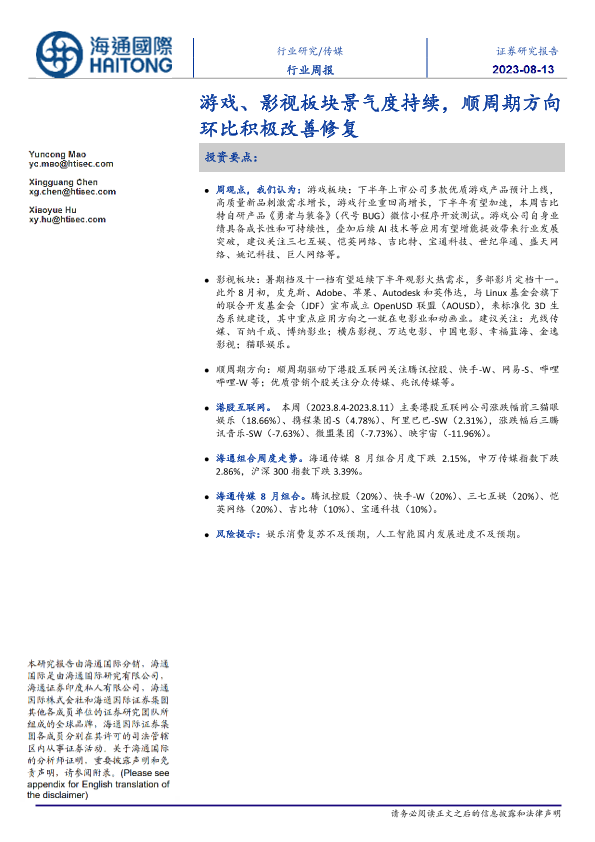 【海通国际】【20230813】传媒行业周报:游戏、影视板块景气度持续,顺周期方向环比积极改善修复-16页
