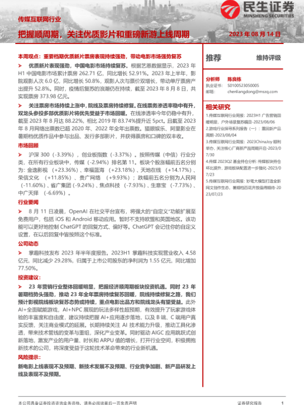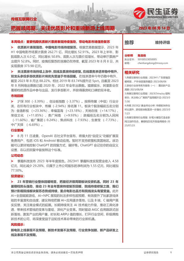【民生证券】【20230814】传媒互联网行业:把握顺周期,关注优质影片和重磅新游上线周期-23页