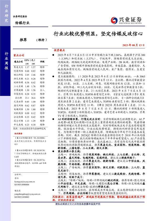 【兴业证券】【20230813】行业比较优势明显,坚定传媒反攻信心-28页
