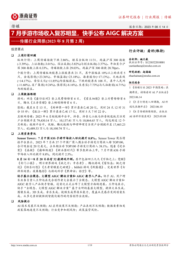 【浙商证券】【20230814】7月手游市场收入复苏明显,快手公布AIGC解决方案-19页
