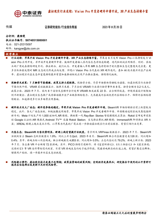 【中泰证券】【20230820】虚拟现实行业追踪:Vision Pro开发者硬件申请开放,XR产业生态持续丰富-13页