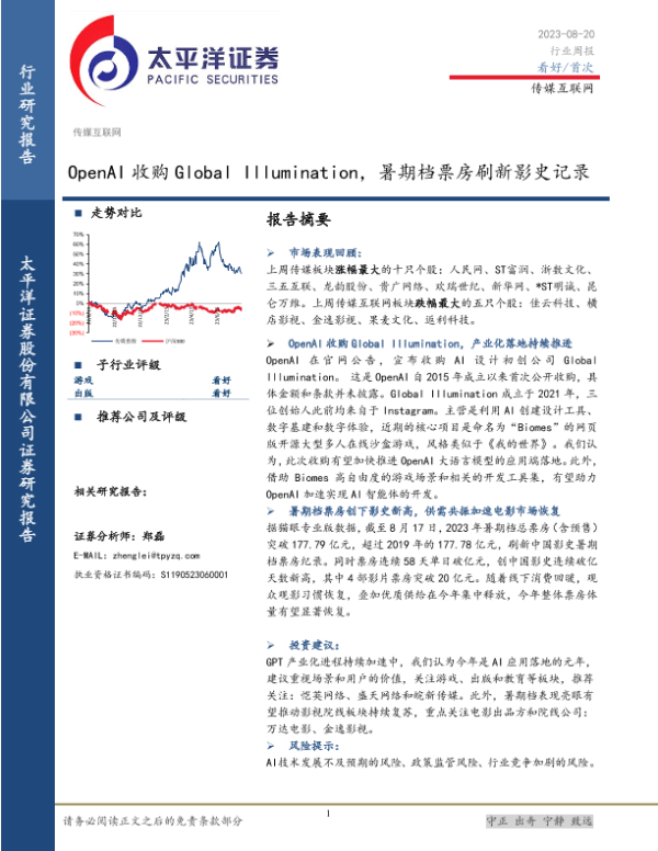 【太平洋证券】【20230820】传媒互联网行业周报:OpenAI收购Global Illumination,暑期档票房刷新影史记录-18页