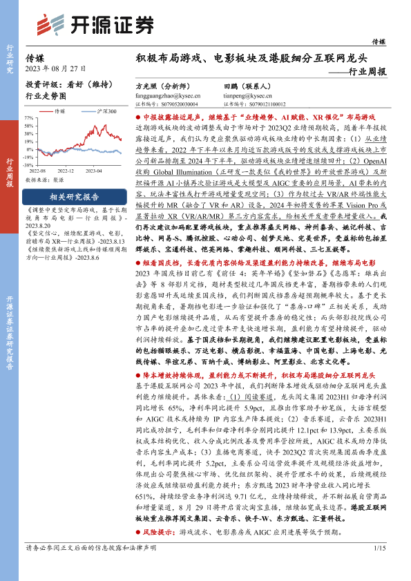 【开源证券】【20230827】传媒行业周报:积极布局游戏、电影板块及港股细分互联网龙头-15页