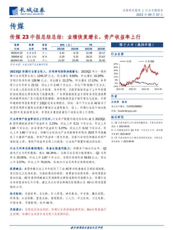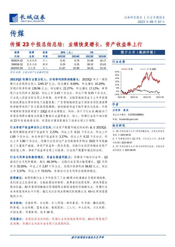 【长城证券】【20230907】传媒23中报总结:业绩恢复增长,资产收益率上行-10页