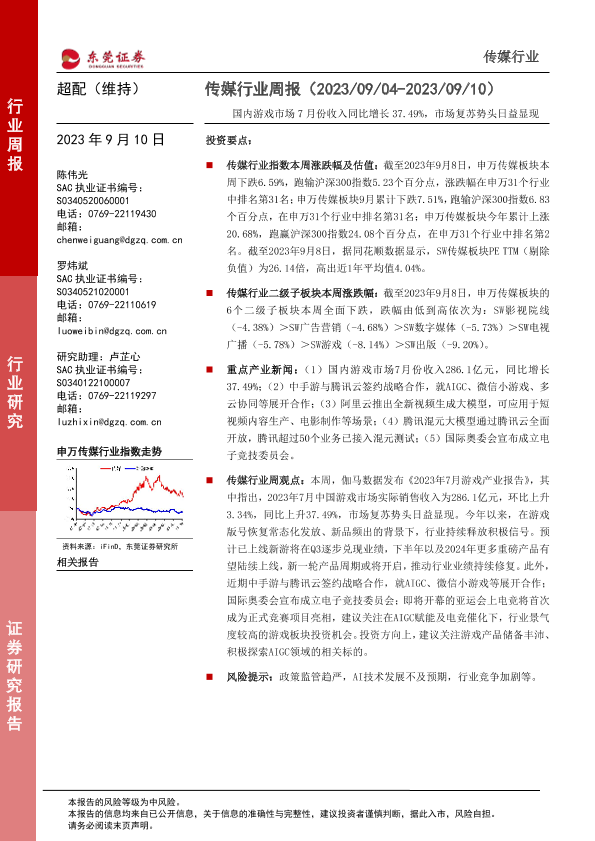 【东莞证券】【20230910】国内游戏市场7月份收入同比增长37.49%,市场复苏势头日益显现-13页