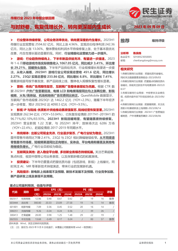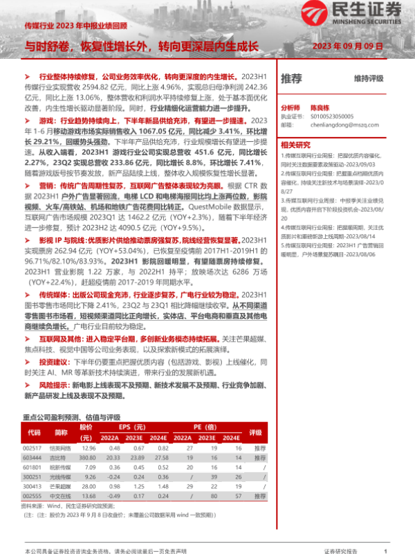 【民生证券】【20230909】传媒行业2023年中报业绩回顾:不时舒卷,恢复性增长外,转向更深层内生成长-27页