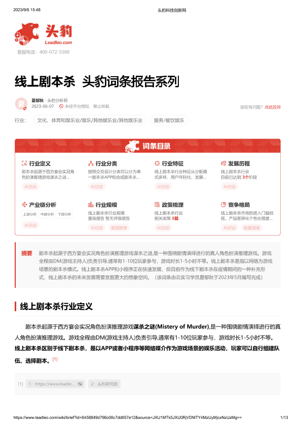 【头豹研究院】【20230913】线上剧本杀 头豹词条报告系列-13页