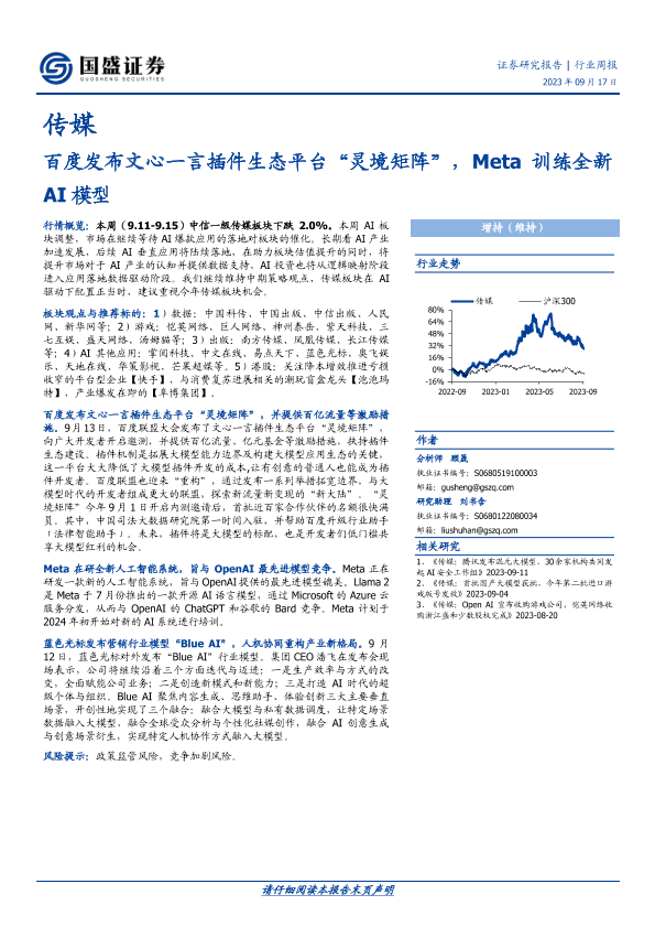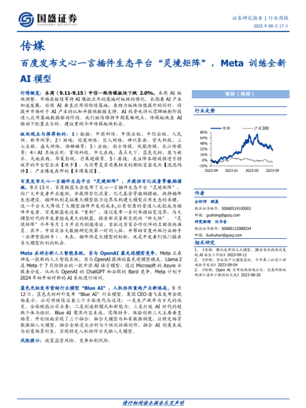 【国盛证券】【20230917】传媒行业周报:百度发布文心一言插件生态平台“灵境矩阵”,Meta训练全新AI模型-10页
