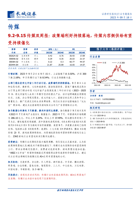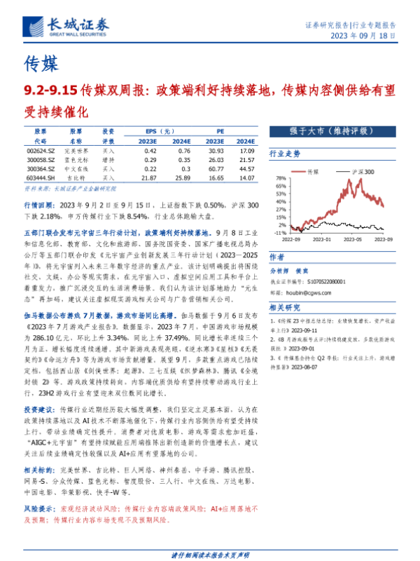 【长城证券】【20230918】传媒双周报:政策端利好持续落地,传媒内容侧供给有望受持续催化-14页