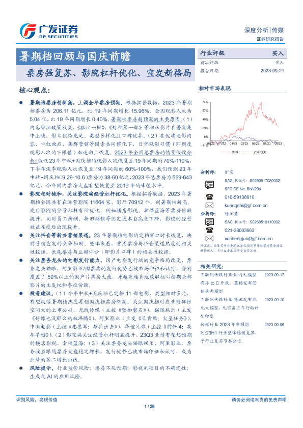 【广发证券】【20230921】传媒行业暑期档回顾与国庆前瞻:票房强复苏、影院杠杆优化、宣发新格局-28页